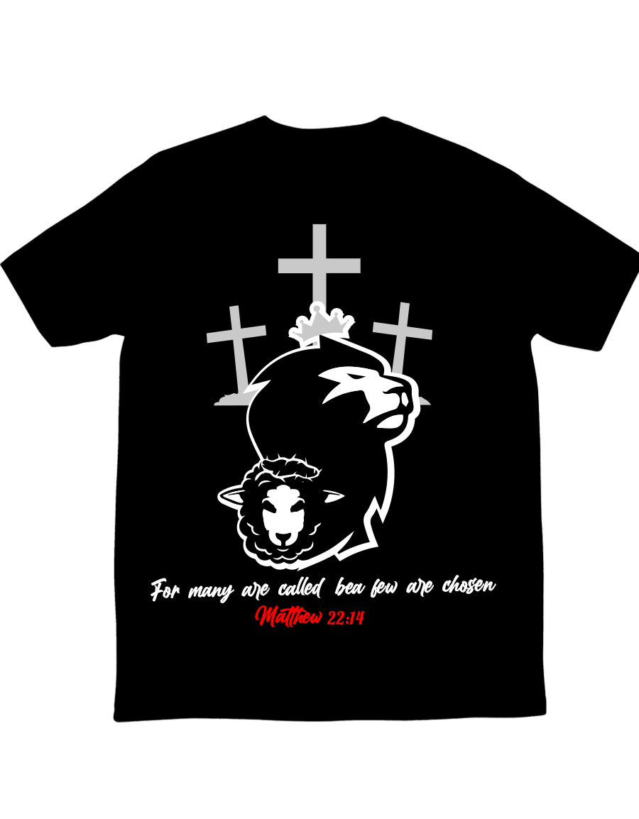 The EKLEKTOS Tee in Black features a large Urban Script across the front chest. The Back has a large graphic of three Crosses and a Lion and Lamb with Bible scripture Mattrew 22:14